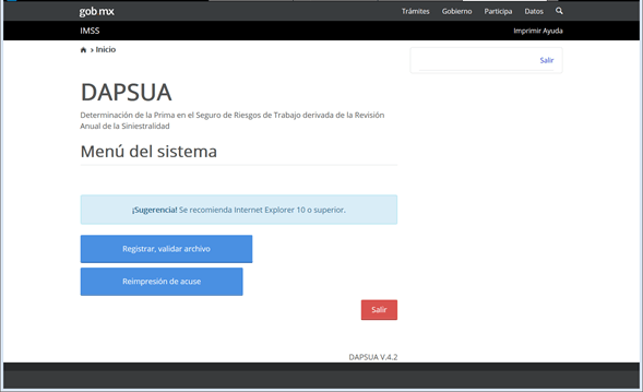 10. Al ingresar a la aplicación DAPSUA, seleccionar el botón “Registrar, Validar archivo”.