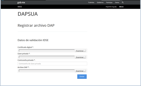 11. Se despliega la siguiente pantalla en donde se deberá capturar el certificado digital, la clave y cargar el archivo “.DAP” generado en el SUA, según el paso 7.